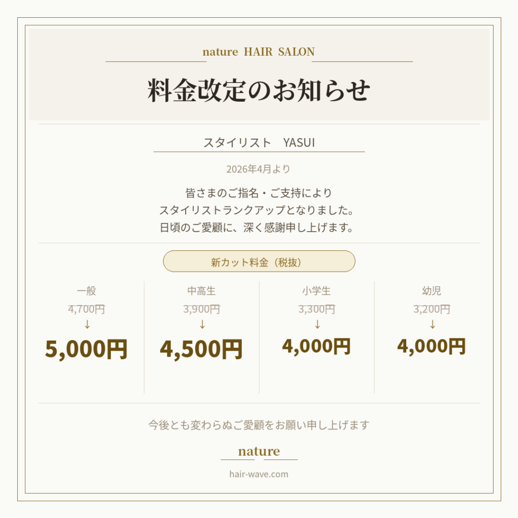 つきましては、2026年4月1日より、YASUIのカット料金を下記のとおり改定させていただきます。